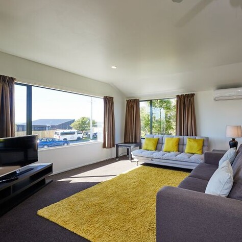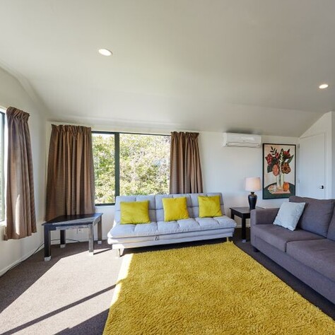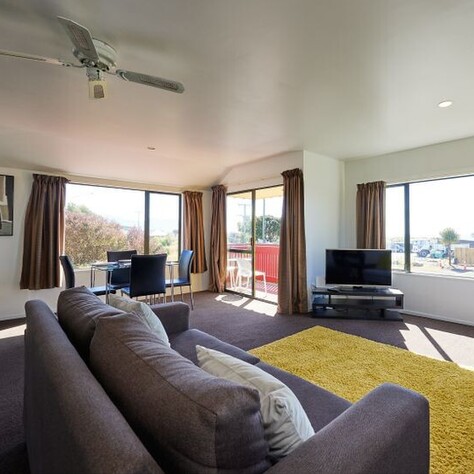 Upstairs you’ll find a spacious and comfortable open-plan living area. With a Smart TV, heat pump and fans, this is the perfect spot to gather and unwind after a busy day of adventuring. Step out onto the balcony and take in the snow-capped peaks and sea breeze!